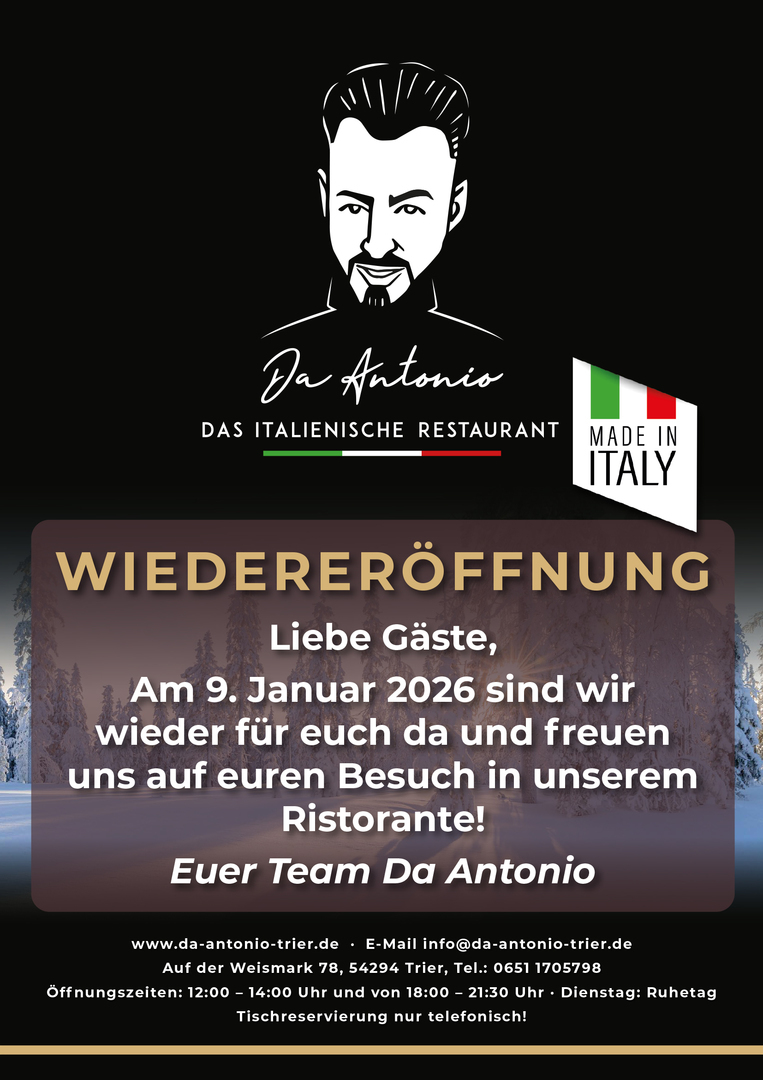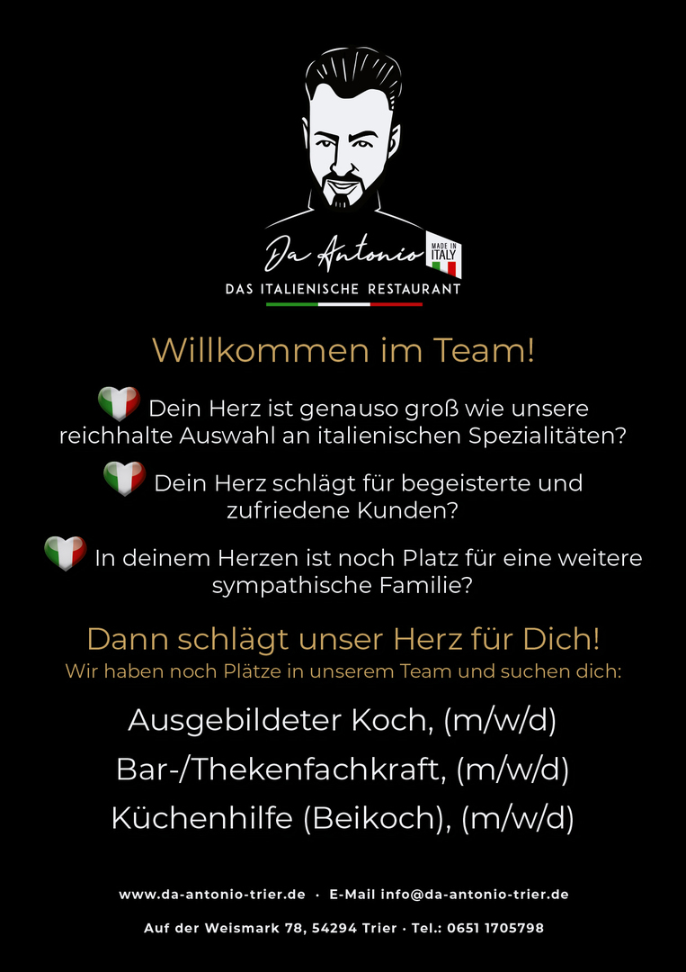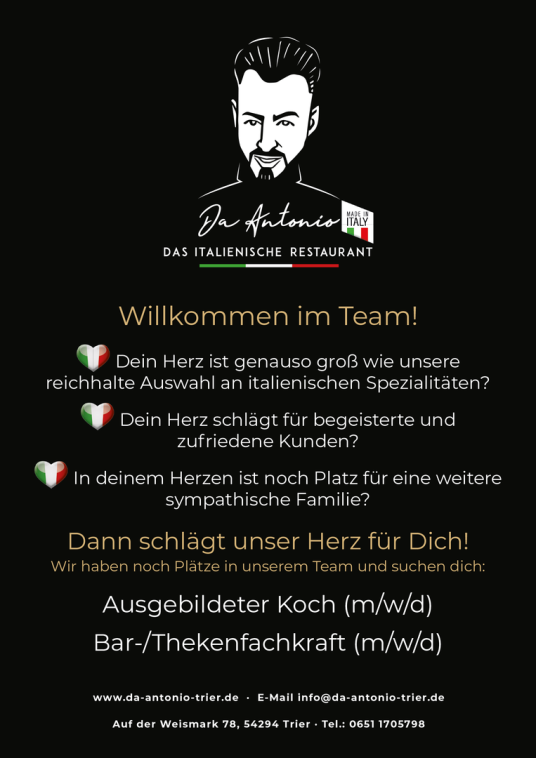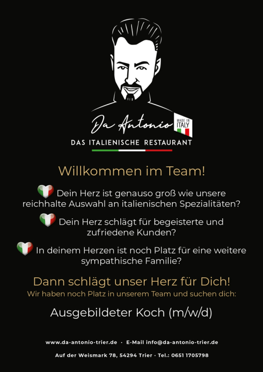 Wichtig ist uns also nicht nur, gutes Essen und Trinken und einen guten Service anzubieten: Genuss, Geselligkeit, Gemütlichkeit und Fröhlichkeit stehen bei uns an erster Stelle. Wer zu DA ANTONIO kommt, soll sich wohlfühlen wie zu Hause oder wie bei guten Freunden. Dafür leben und arbeiten wir!
