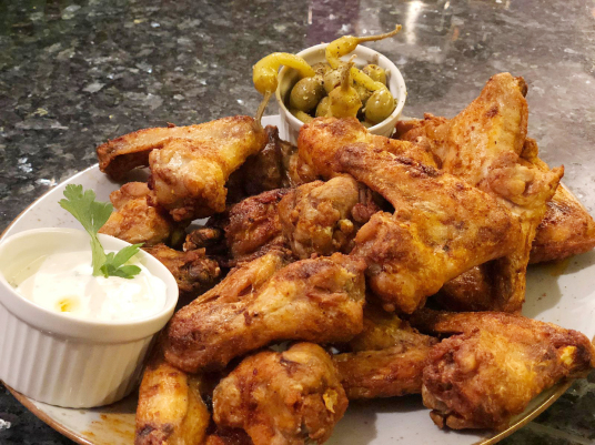 Mit drei verschiedenen Dips: Knoblauch, Curry, Barbecue.